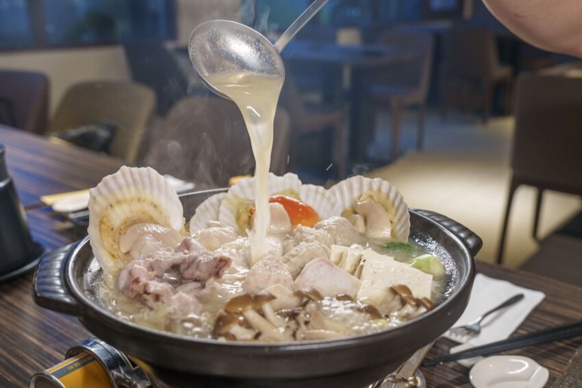 石狩味增湯,採獨立一人一大鍋的方式,鍋內的食材相當豐富,有蔬菜、菇類、嫩豆腐、芋頭塊、豆包、魚片、大扇貝、手工魚丸、寬冬粉和梅花豬肉片, 不使用加工過的火鍋料,非常天然健康。