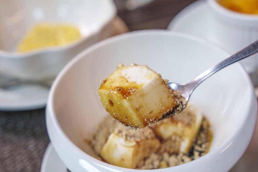 日式杏仁豆腐綿細口感,杏仁豆腐與黃豆粉與黑糖醬根本就是默契好朋友