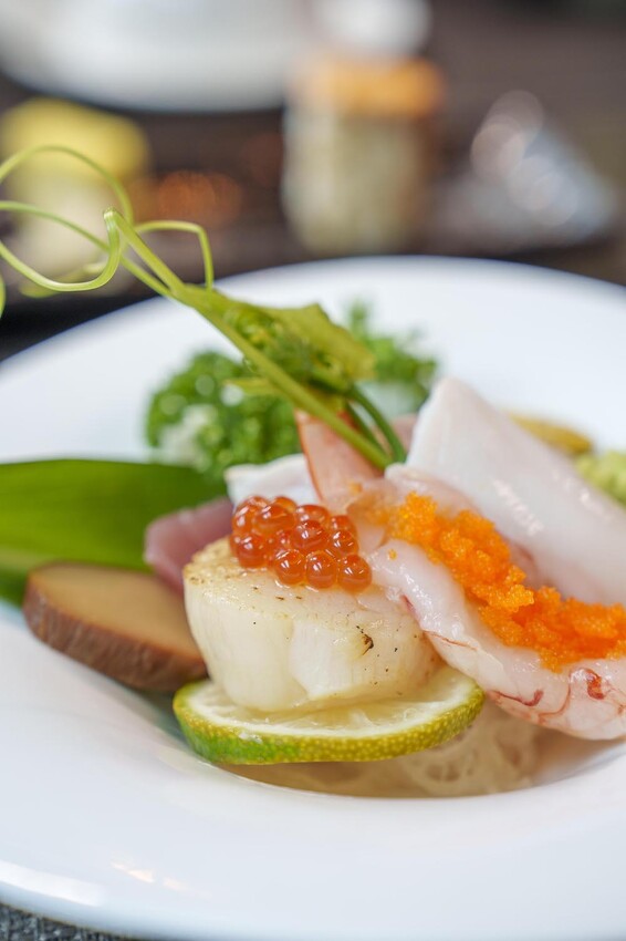 綜合刺身,依照每天海鮮進貨不同可以吃到季節生魚片、微炙干貝、軟絲、生食蝦(柳葉魚卵)、滷杏鮑菇