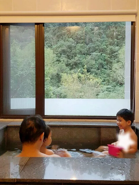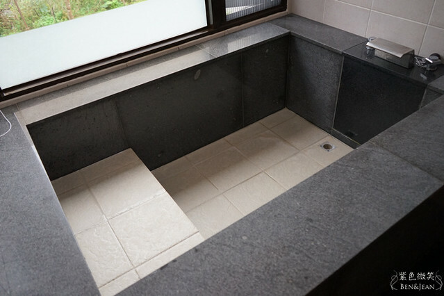 這湯池也不算小,至少我們二大二小是綽綽有餘的空間,因為本來就是以二人設計的湯屋,整體的空間算是合適,湯池底部有防滑的磁磚,但進出湯池還是要小心