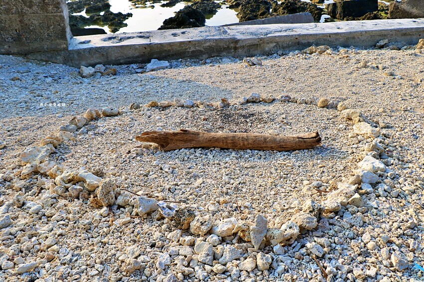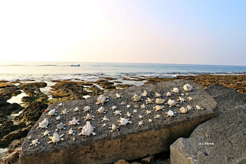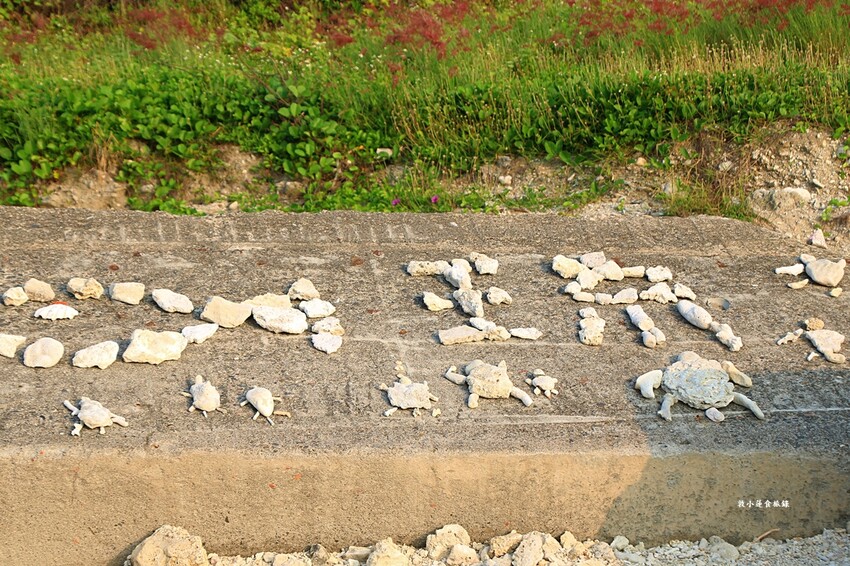 離防坡堤有段距離的岩石,上頭有大大小小的海龜,上頭的字好像是琉字