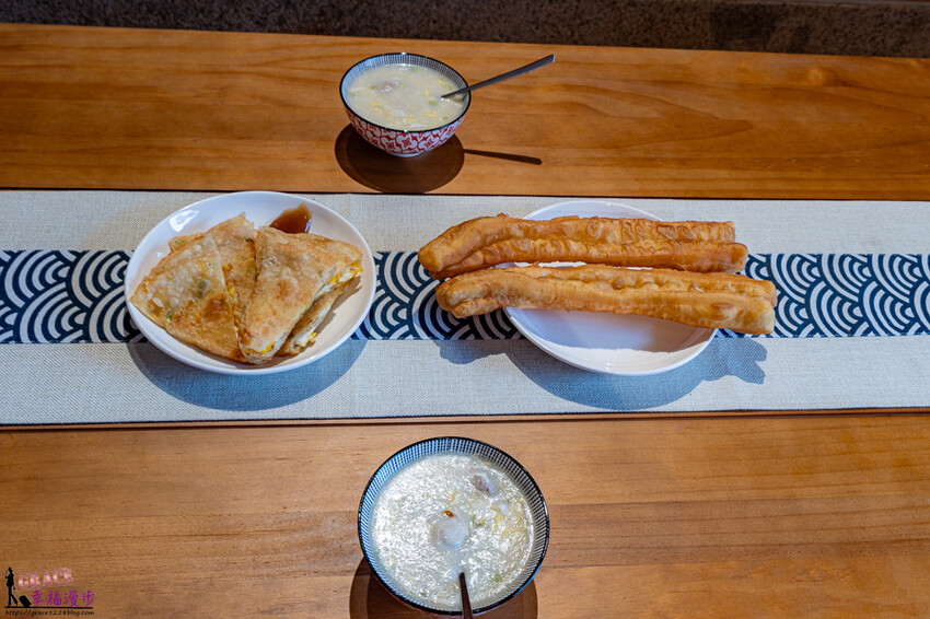 只要是入住兩晚以上民宿會贈送早餐,但因爲早餐是贈送品項,若個人因素不用餐是不另行退款,闆娘相當用心兩天的早餐都是不同品項,都是在地的美食,第一天是蔥油餅、油條和廣東粥,這早餐真的很美味喔!