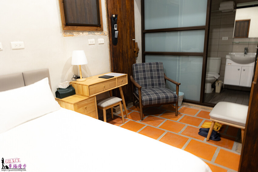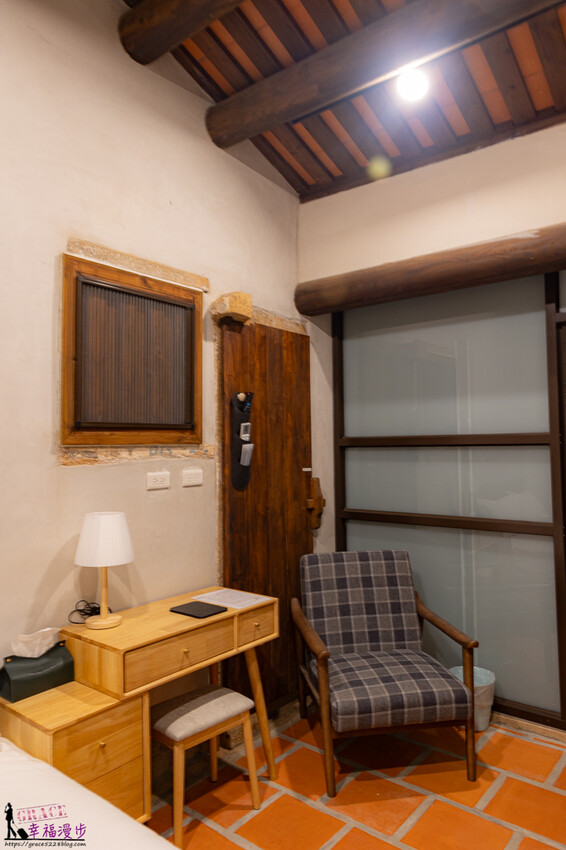 接下來介紹我入住的房間,門口前的房號牌很有時尚感,有著傳統的木門和紗窗門避免蚊蟲進入。