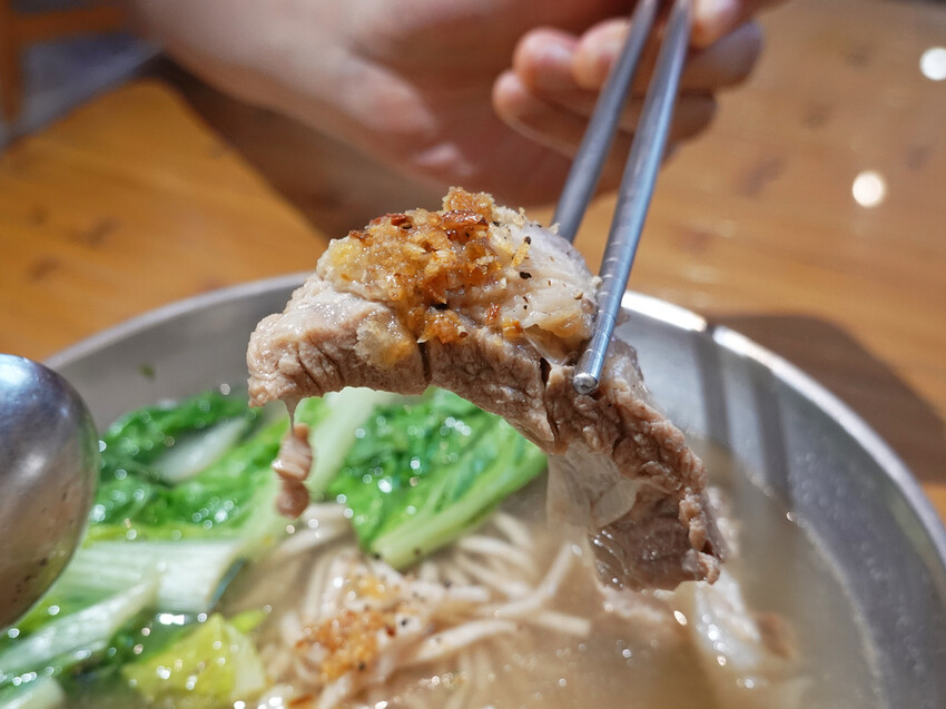以大骨長時間熬煮的湯底呈現白濁色,上頭擺著幾塊軟骨,還有些許的青菜跟蘿蔔,光用看的就令我食指大動。而蘿蔔是令人驚豔的甜。