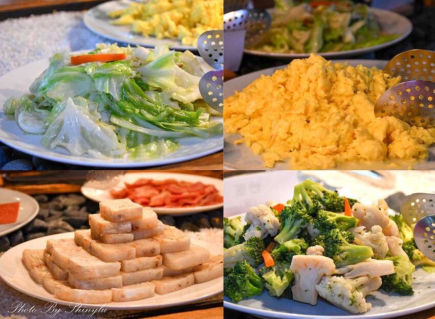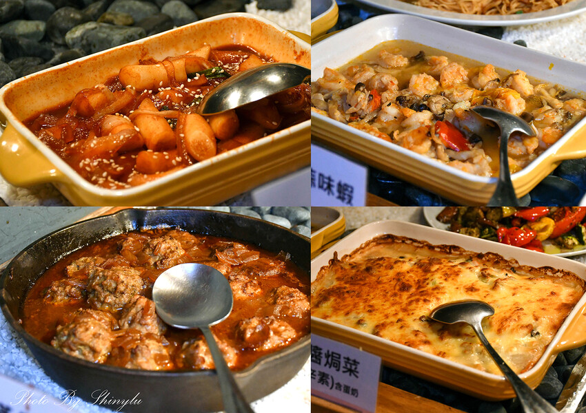 季節時蔬、油泡蒜味蝦、奶醬焗菜、肉丸、炒年糕、水果…等
