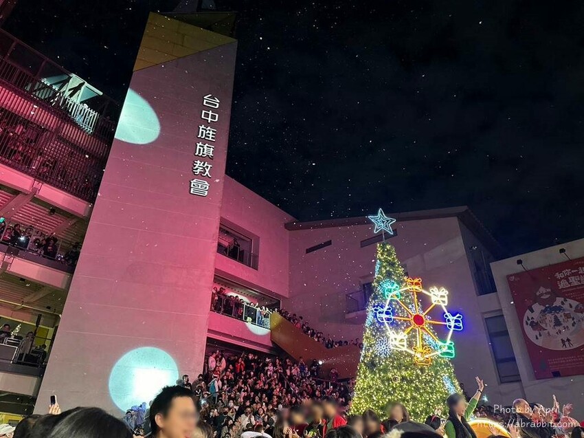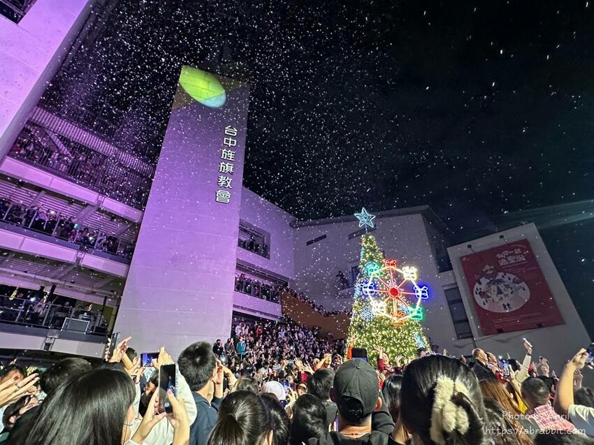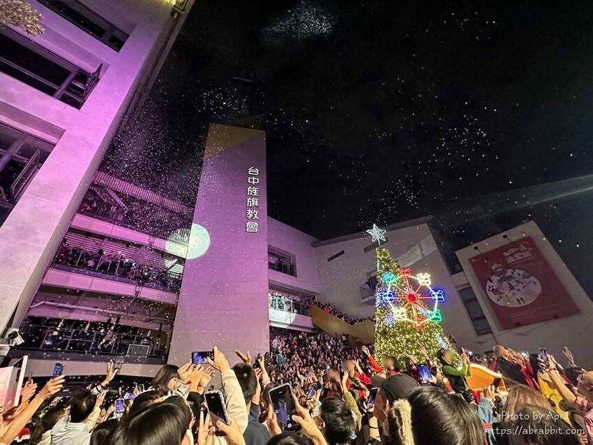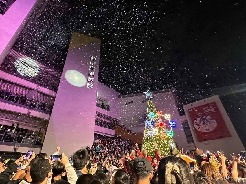 首先登場的就是12月2日的點燈,每年12月旌旗教會都會在台中母堂這邊點亮巨型聖誕樹,象徵與宣告聖誕的來臨,這已成為旌旗教會的傳統。點燈當天有一連串的暖場敬拜,倒數結束、聖誕樹點燈亮起時,天空還撒下雪花,簡直太浪漫啦!