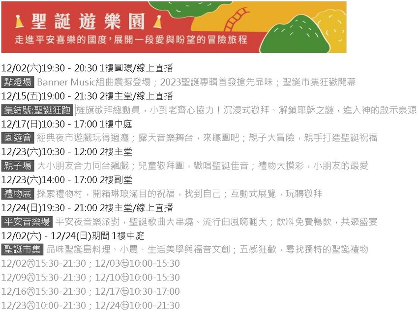 接著還會有一連串的活動,沉浸式敬拜、園遊會、親子場、禮物展、假日聖誕市集與24日平安夜的大型的音樂派對,讓人好期待啊!市集都是假日才有擺攤,有經過的朋友們可以來逛逛。