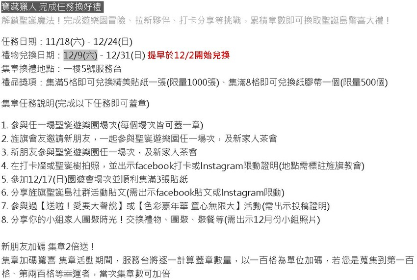 這些活動都可以打卡、積點數,可以換小禮品!快點跟我一起沉浸在這歡樂、頌讚、平安的12月吧!