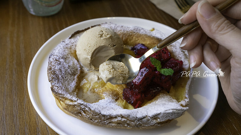 冰淇淋部分風味需+20元 (根據菜單) 荷蘭寶貝鬆餅也有人稱它為鐵鍋鬆餅基本上蓬鬆的口感邊緣著有酥酥的口感,搭配冰淇淋與季節水果,趁熱吃不然會慢慢垮下變得有點軟,現點現做約20分鐘!