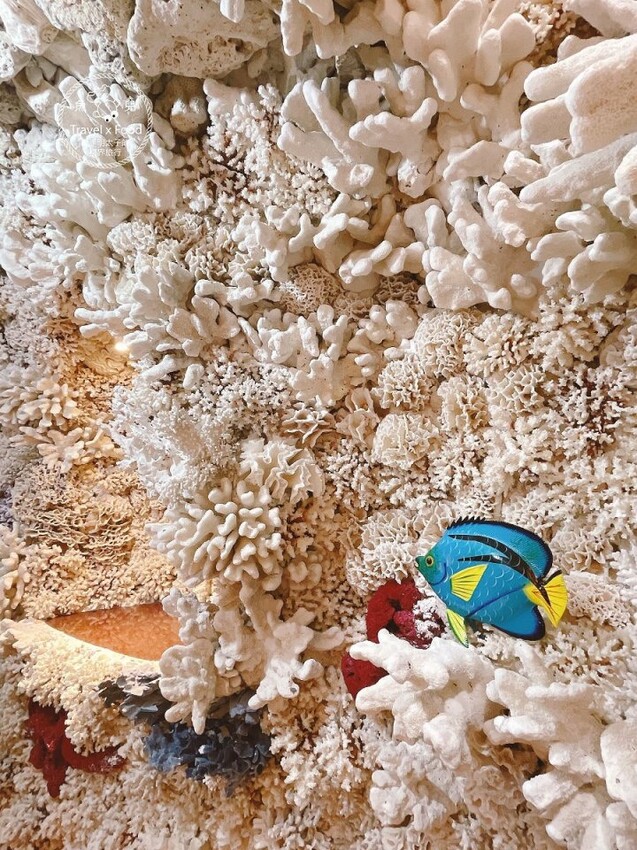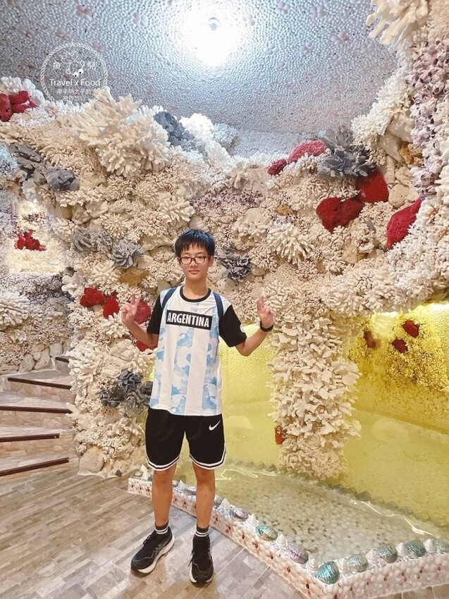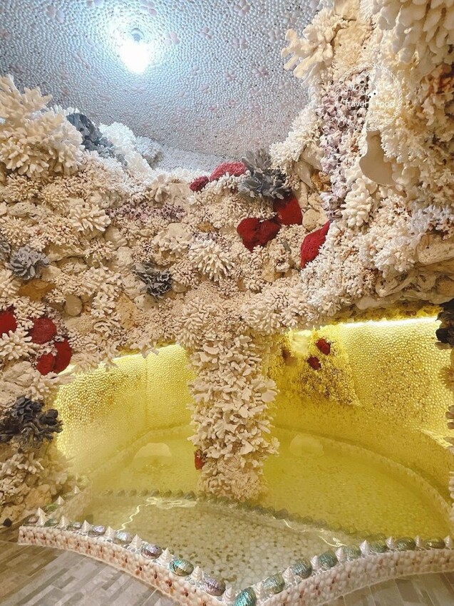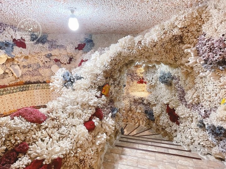 天花板與牆面滿滿的貝殼與珊瑚,彷彿走進海底龍宮般,唯美浪漫。而隧道裡有些蜿延,材料比較尖銳,經過時得稍作留意,不小心可是會受傷的。