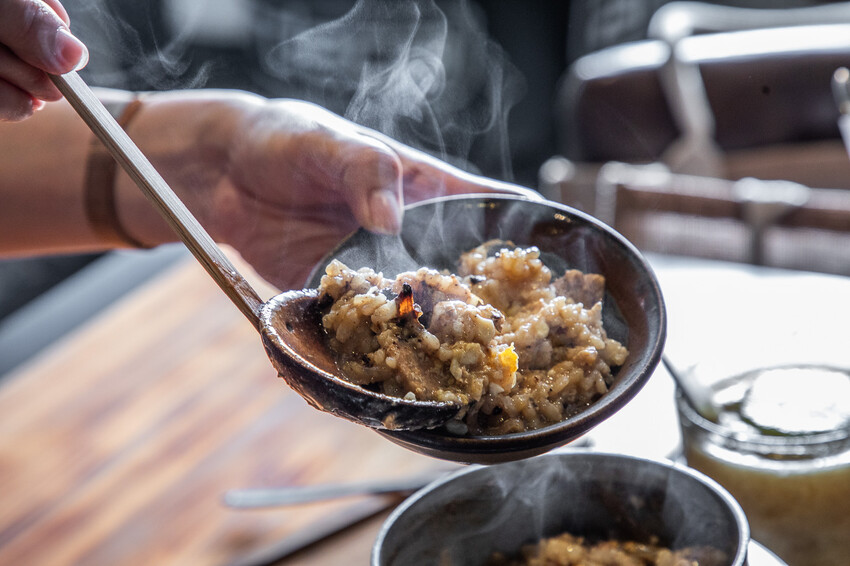 粥體經過長時間熬煮,形成滑順細膩的口感,麻油的獨特香味與黑蒜的深邃甜味融合,形成一種溫和而馥郁的香氣,麻油的醇香,黑蒜的微甜和獨特的發酵風味以及雞肉的鮮香,三者在口中交織,層次豐富