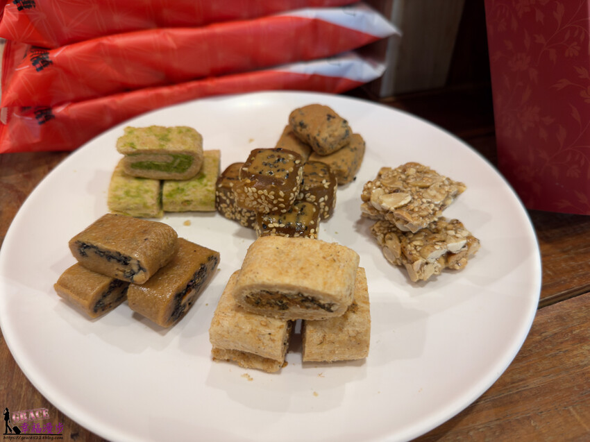聖祖的貢糖一共有11種口味,我挑選了六款貢糖買回家,左上是芙蓉酥,加上抹茶、杏仁片的花生酥還蠻搭的耶!我很喜歡種酥鬆口感的貢糖,而且也不會太甜膩喔!