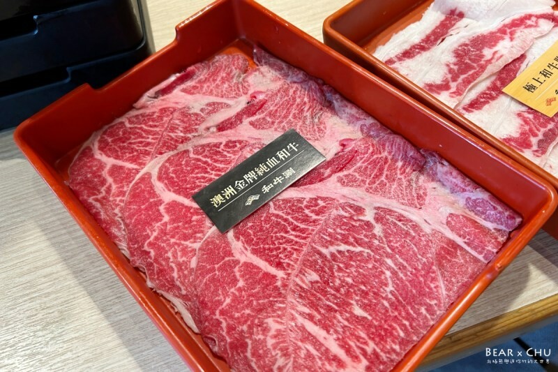 豐富脂肪與濃郁肉香是和牛的迷人之處,我們選的成人每人$858的頂級和牛套餐,包含澳洲金牌純血和牛、極上和牛霜降、極上和牛雪花、極上和牛胸腹肉,另外最右邊是沒有列在菜單上,看來是期間限定的極上和牛膝下,不同部位的油脂分佈和比例不同,吃起來口感和風味也都有些差異,下鍋涮幾秒變色就品嚐,吃起來香又嫩、新鮮美味。