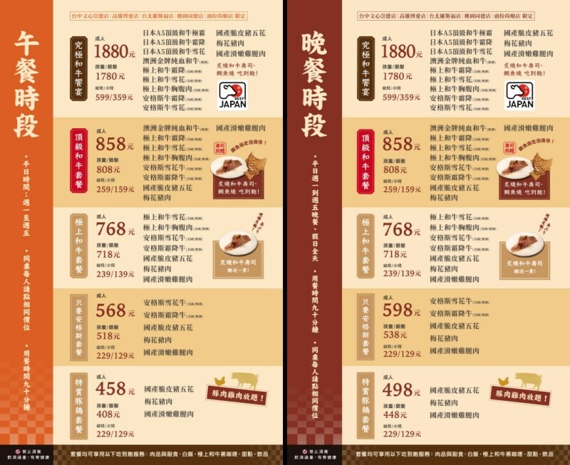 和牛涮日式鍋物放題的火鍋湯底是鴛鴦雙拼,除了固定的干貝昆布湯之外還可以再五選一,價錢區間主要差別是包含不同肉品、和牛吃到飽品項,但如果既然都要來吃和牛了建議就挑有含炙燒和牛壽司吃到飽的價位,而且鯛魚燒吃1、2個用單點價格算就不少了,我們這次吃的成人每人$858的頂級和牛套餐。
