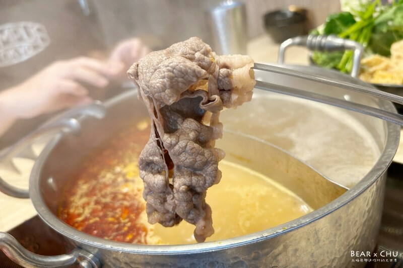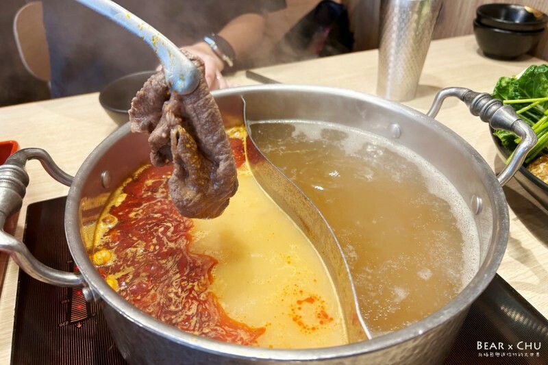 除了和牛涮固定搭配的火鍋湯底干貝昆布之外,另一半我們還選了椒香麻辣湯底,干貝昆布湯底鮮甜美味、椒香麻辣湯底微辣微麻,兩種湯底我都蠻喜歡的,肉片下鍋在椒香麻辣火鍋湯底裡涮幾秒帶著微辣感吃起來很過癮,蔬菜、豆皮等在干貝昆布火鍋湯底裡滾煮後,但上湯頭的鮮甜味道吃起來清爽美味,跟我們平常一樣吃火鍋不沾醬,只有湯底烹調後的鮮美就很足夠。
