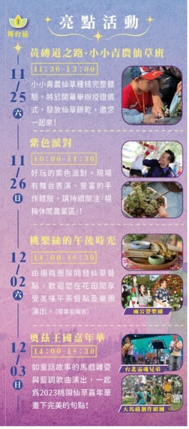 #2023桃園仙草嘉年華💜主題: 童話仙境活動日期:2023/11/25-2023/12/03開放時間:09:00-17:00地址:桃園市楊梅區楊湖路三段239號官方活動資訊: 2023桃園仙草嘉年華