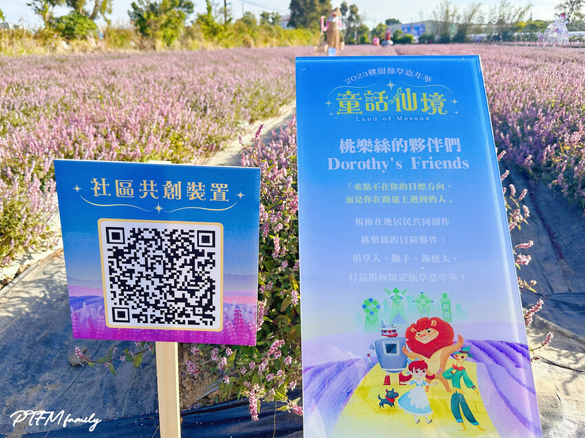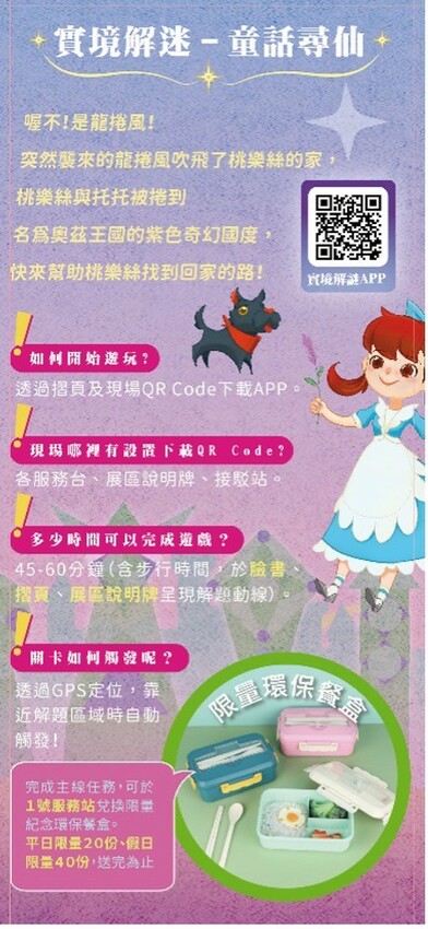 以桃樂絲繪本為主題還原故事中的每個場景,將場景佈置在紫色花海區,讓遊客漫步穿梭在裡頭並結合實境解迷遊戲。