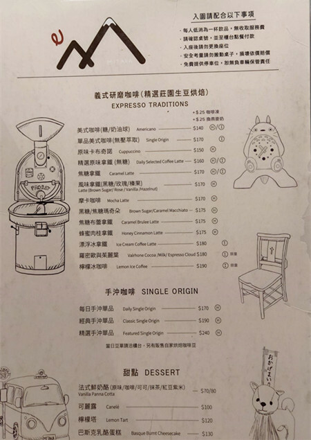 菜單正面是以咖啡和甜點為主,咖啡價位$140~240,甜點$100~130
