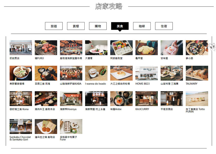 匠割烹店/FUKUFUKU/鳥取港海鮮賀露市場/大榎庵/阿部鳥取堂/龜甲屋/甘味屋/夢小路/鹿野蕎麥道場/豆腐工房 雨滝/山陰海鮮炉端KABA/I wanna do Iwado/大江之鄉自然牧場/HOME 8823/山菜料理 三滝園/TALMARY/御好燒工房 Kona/燒肉牛王 鳥取本店/海鮮祭Hoenya/海鮮問屋 村上水產/味曆Anbe/KAJICURRY/平尾豆腐店/布丁專賣店 Totto PURIN/Sankaku Chocolat & Sankaku Gori/潘朵拉之箱 鳥取店/貝殼最中和菓子 Fune