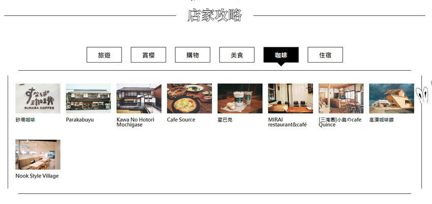 砂場咖啡/Parakabuyu/Kawa No Hotori Mochigase/Cafe Source/星巴克/MIRAI restaurant&café/[三滝園]小鳥のcafe Quince/高濱咖啡館/Nook Style Village