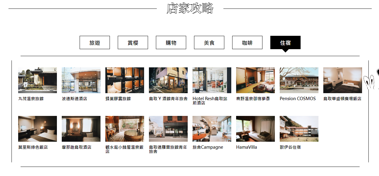 鳥取砂丘/砂之美術館/鳥取砂丘遊客中心/仁風閣・宝扇庵/白兔神社/白兔海岸/吉岡溫泉/鳥取民藝美術館/湖山池 阿彌陀堂/觀音院庭園/雨滝瀑布/鳥取市佐治天文台/因州中井窯/鳥取車站/西脇海岸/浦富海岸・環島遊覽船/若櫻鐵道/若櫻民工藝館/不動院岩屋堂/隼車站/智頭宿/石谷家住宅/戀山形車站/浜村温泉/河原城/鳥取市國際遊客支援中心
