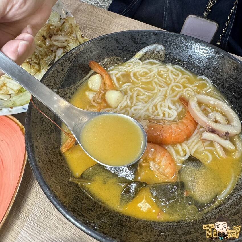 酸V帶辣與海鮮甜味的湯頭很有泰式風味,小辣程度也很開胃~