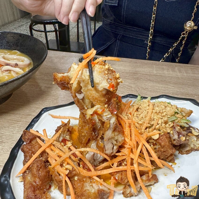 泰式椒麻雞(170元)記得將酸辣醬淋在雞肉上或沾著醬料一起吃,酸辣口味才能跟炸雞肉融為一體