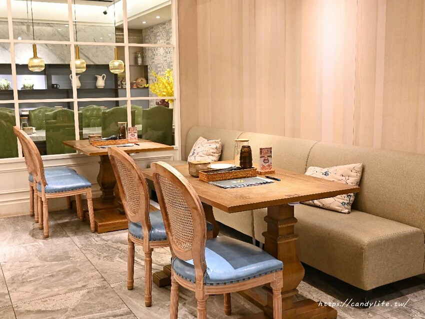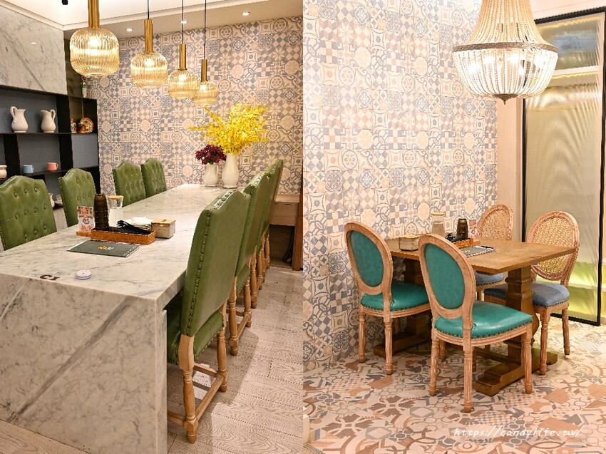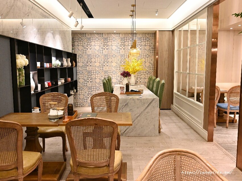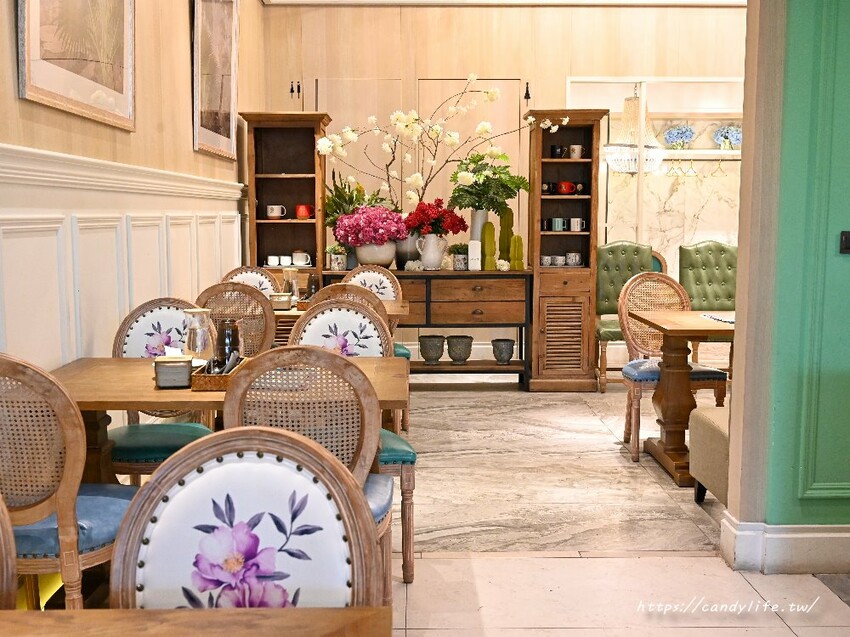 雛菊見不只外頭宮廷風造景的庭院,店裡頭的裝潢更是美到不行,一樣以宮廷風為主軸,空間採挑高設計,搭配綠色植栽造景、木質桌椅及精美吊燈,裝潢超有質感,彷彿來到宮廷裡用餐呢
