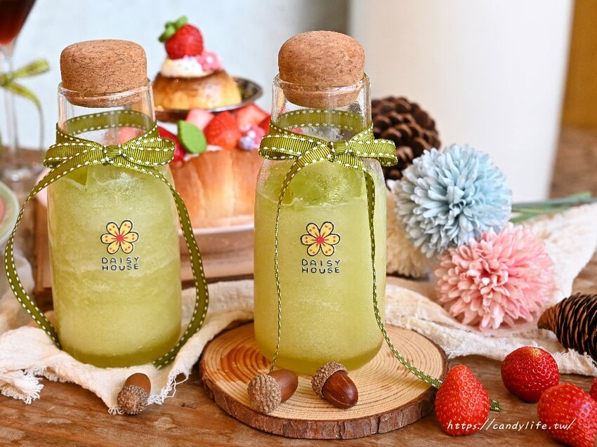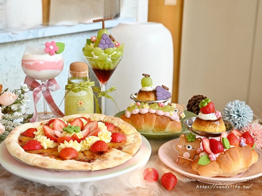 雛菊見這次推出的期間限定新品有翡翠葡萄之森(綠葡萄系列)跟莓好秘密花園(草莓系列),翡翠葡萄之森包含精靈葡萄魔法芭菲、綠寶石之瓶及森之花舞鹽可頌;莓好秘密花園包含濃情卡士達草莓披薩、紅心莓鹽果昔及莓莓雪戀鹽可頌,每一道看起來都好美