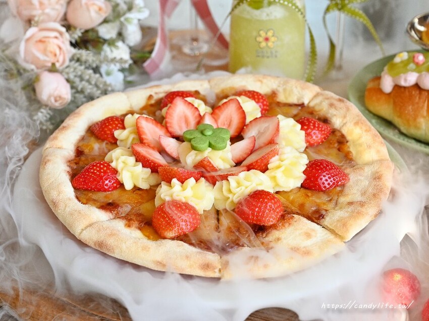 這道濃情卡士達草莓披薩上桌時還有冒煙,畫面超級美!採用手工現桿現做的披薩餅皮,基底抹上自熬的草莓果泥,鋪上乳酪絲,搭配新鮮大湖草莓,最後擠上自製卡士達醬