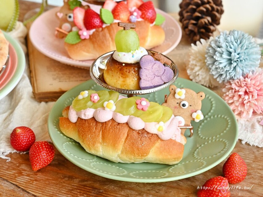 另外這款森之花舞鹽可頌跟剛剛的莓莓雪戀鹽可頌很像,不過主角草莓換成了葡萄,一樣採用現烤出爐的鹽可頌,這次中間夾入了包葡萄冰心內餡的麻吉,搭配香濃葡萄香堤與新鮮綠無子葡萄,最後加上可愛的手工餅乾點綴,每一口都可以吃到葡萄的酸甜滋味,整體吃起來依舊爽口不甜膩