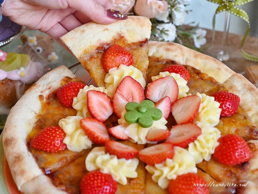 披薩餅皮薄脆,麵香迷人,草莓飽滿多汁,帶微酸滋味,搭配卡士達醬及起司,鹹甜交織,好吃不膩口