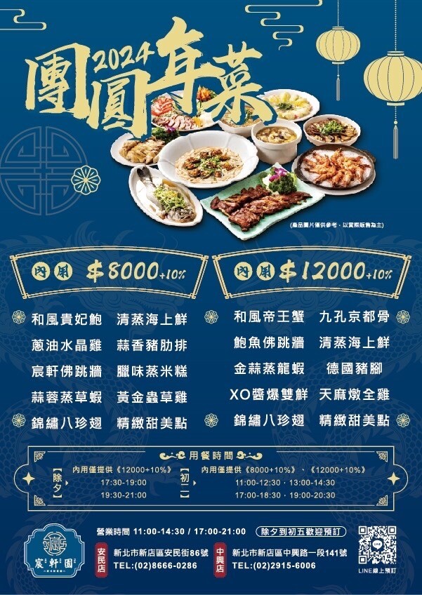 除夕內用僅提供12000元桌菜,初二內用提供8000元及12000元的桌菜,初二接女兒回娘家也可以吃好料。