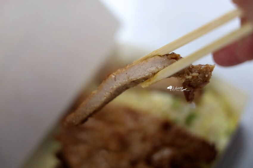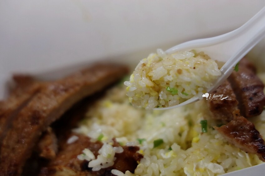 不過最喜歡的是這個蛋炒飯,不偌一般加了醬油,僅以鹽提味,並放了足量的蔥的及蛋花,米飯粒粒分明,香氣很足且不油膩,雖然最後在便當底層發現一層油,但入口真的很乾爽,很好吃!