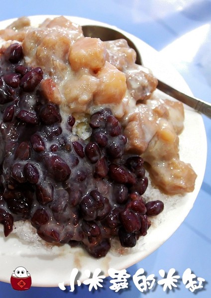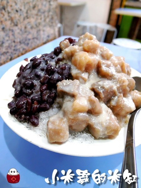 一上桌就看到,在雪白的剉冰上鋪了滿滿的紅豆與芋頭配料~~
