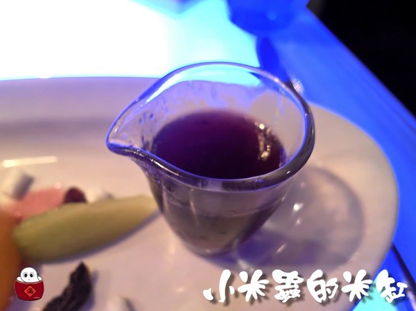 桌上的餐具,水藍色的餐盤,透過藍光的折射,是如此的炫目迷離~