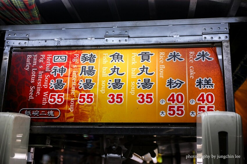 菜單就販售米糕、米粉、貢丸湯、魚丸湯、豬腸湯和四神湯,米糕跟米粉有大、小碗之分。