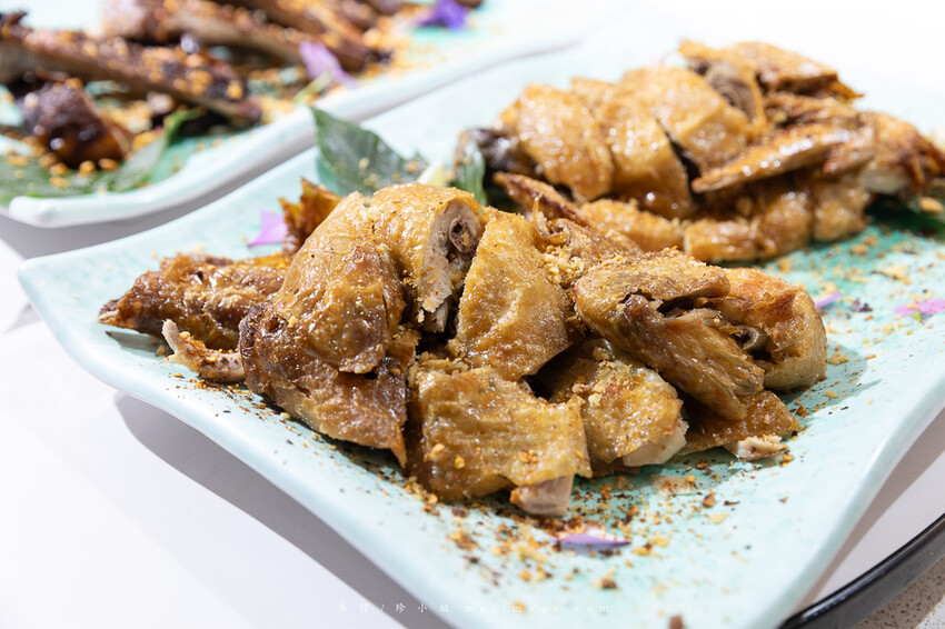 這一道是宸軒園的招牌料理,脆皮雞表現相當亮眼。脆皮雞上面還灑上了蒜酥,讓香氣更上一個層次。