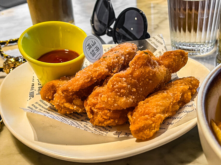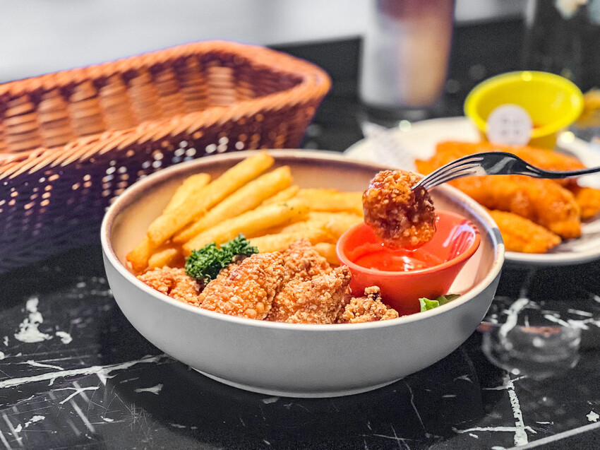 美式雞柳條,美式雞柳條是整條雞柳,外酥內軟還很多汁,且他的外皮是薄脆還有調味的那種,就算不沾醬也很涮嘴
