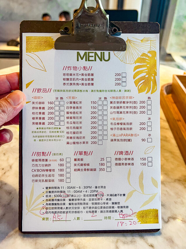 滿山望海的餐點選項不會很多,一眼大概就看完了,然後低消是一人$300外加10%服務費,光點一杯飲料沒辦法滿足低消,所以至少要點一個餐或是甜點,加服務費上去一人均價直逼$400
