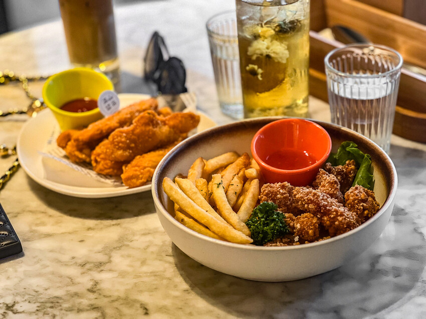 泰式旗魚塊+薯條,算是CP值比較高的炸物組合,泰式旗魚塊出乎我意料的還蠻好吃的,旗魚塊是比較紮實Q嫩的口感,沾點泰式醬料很合拍,薯條就是一般的馬鈴薯條