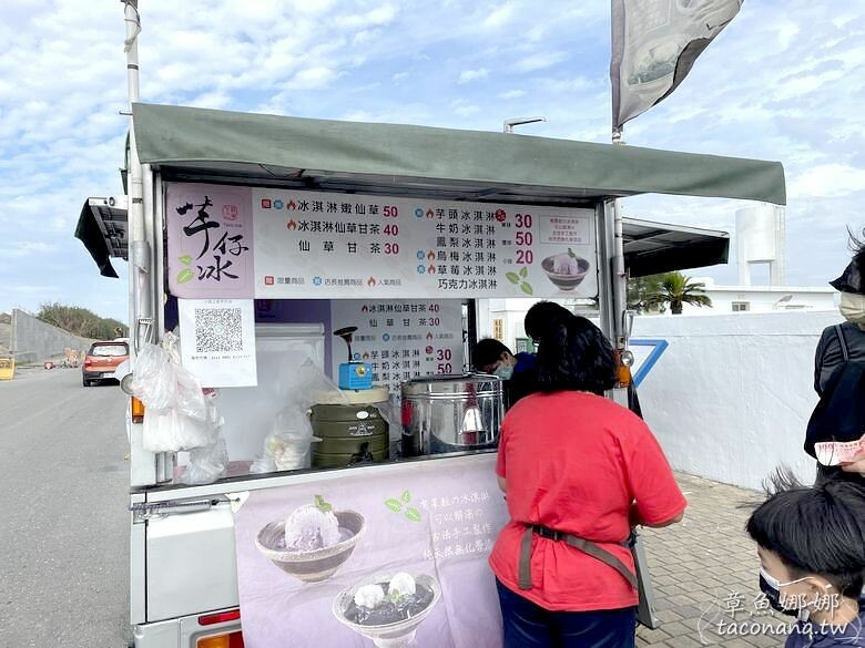 一旁有賣芋冰的餐車,菜單裡的選項都感覺不錯!一旁就是潮間帶與燈塔。