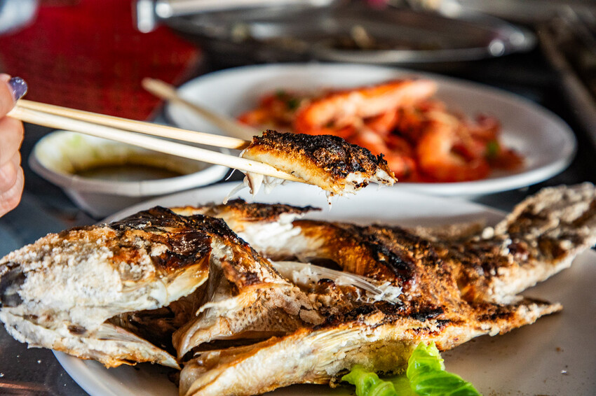 胡椒烤魚技藝真是高超,整條魚烤成金黃色,外皮焦香酥脆,而且散發著濃郁的胡椒香。魚肉的鮮甜完全沒有土味和腥味,即使是像我不怎麼嗜好淡水魚的人也愛不釋口!胡椒的香氣與魚肉的細膩完美結合,讓人一吃難忘