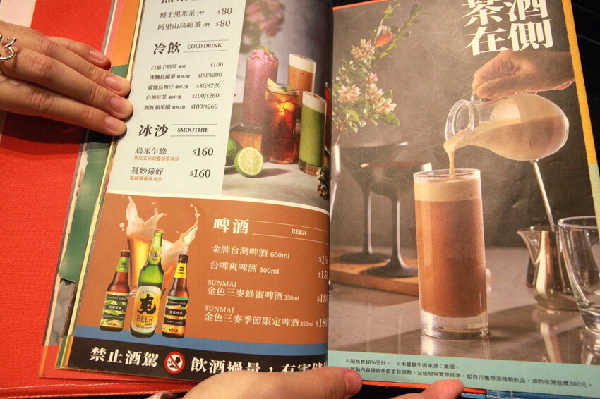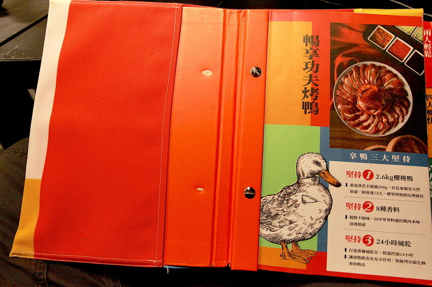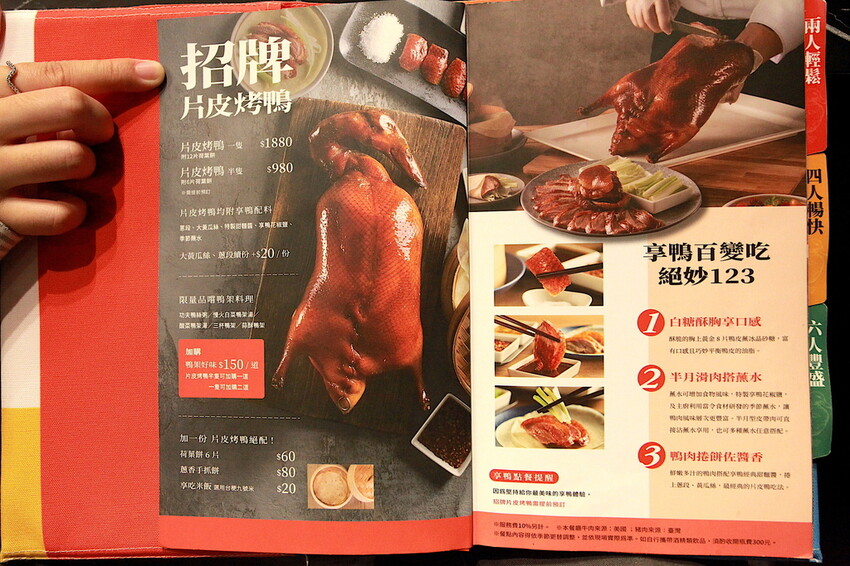 這厚厚一本紅色菜單供顧客點餐參考,菜單主要分類有享鴨推薦類、兩人套餐1420元、四人套餐2980元、六人套餐4480元、開胃小品類、肉食主義類、海鮮類、湯品類、甜品類及飲品類等等,須額外酌收10%服務費喔!