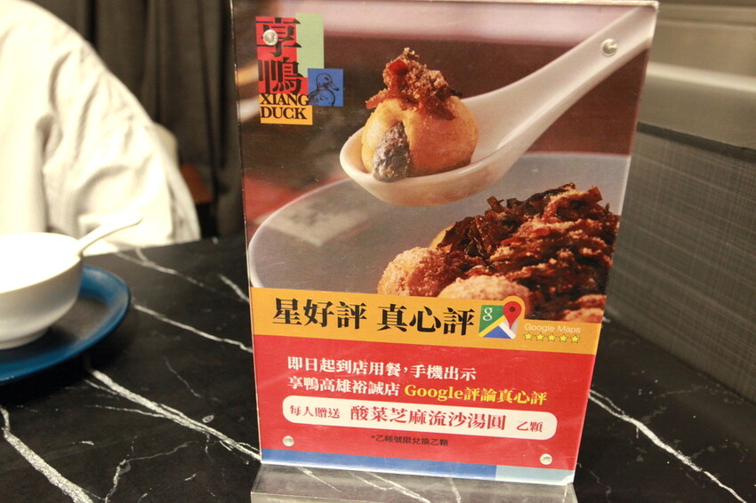 桌面有擺放小立牌有優惠資訊供顧客參考,Goole真心評論每人贈送酸菜芝麻流沙湯圓乙顆。