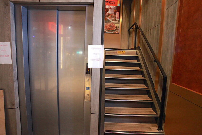 雖然有電梯供顧客搭乘有貼告示「電梯還未完工」。