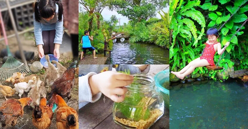 宜蘭親子景點【花泉有機休閒農場】員山戲水撈魚捉小蝦,做生態瓶,超沁涼的湧泉上盪鞦韆!