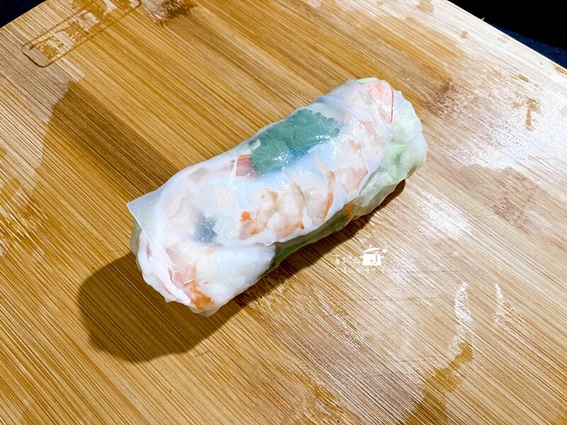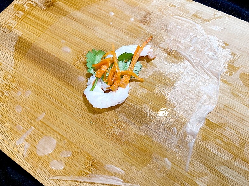 濕軟的生春捲皮平放在砧板上先鋪舒肥雞胸肉(先絲成細絲)再放紅蘿蔔絲和生菜,拉起和材料平行的春捲皮覆蓋在材料上再左右包起後再順向捲收(包法和台灣春捲一樣),重點在捲收時要包緊一點吃的時候才不會一直掉材料