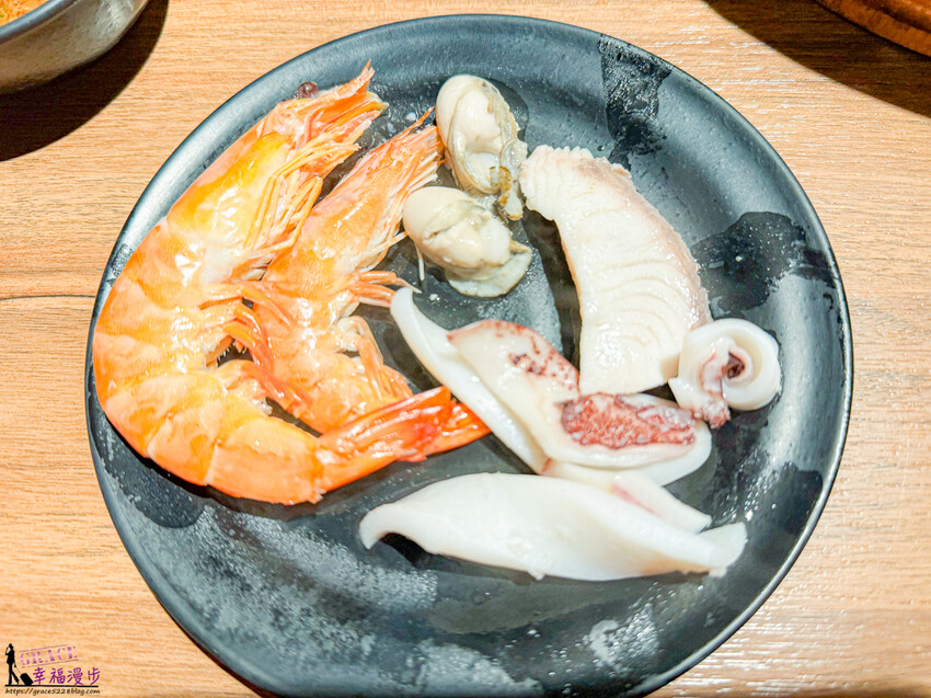 蔬菜盤也是相當豐盛,基本蔬菜還有豆皮、豆腐、菇類、帆立貝、鮮蝦、蟳味棒、水晶餃和丸子等。