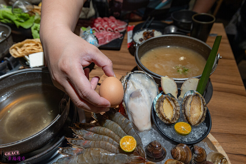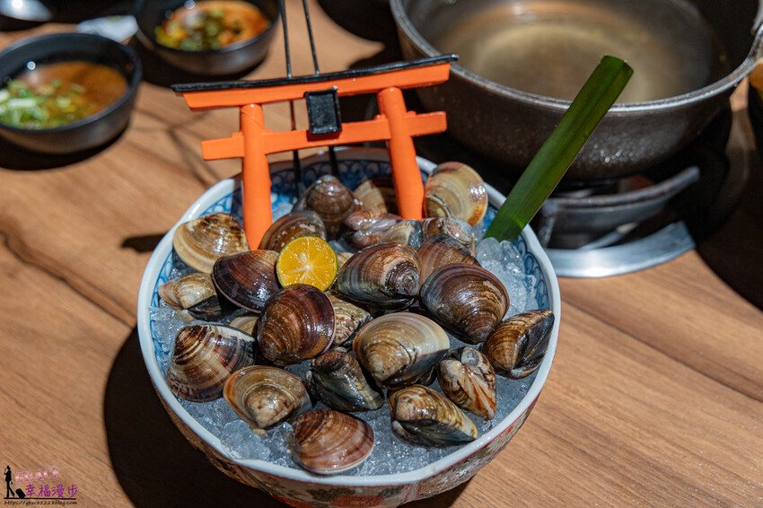 滿滿蛤蜊鍋搭配的是石頭火鍋湯底,好大一碗的蛤蜊用著冰塊保鮮著,上面放著小鳥居擺飾相當可愛。